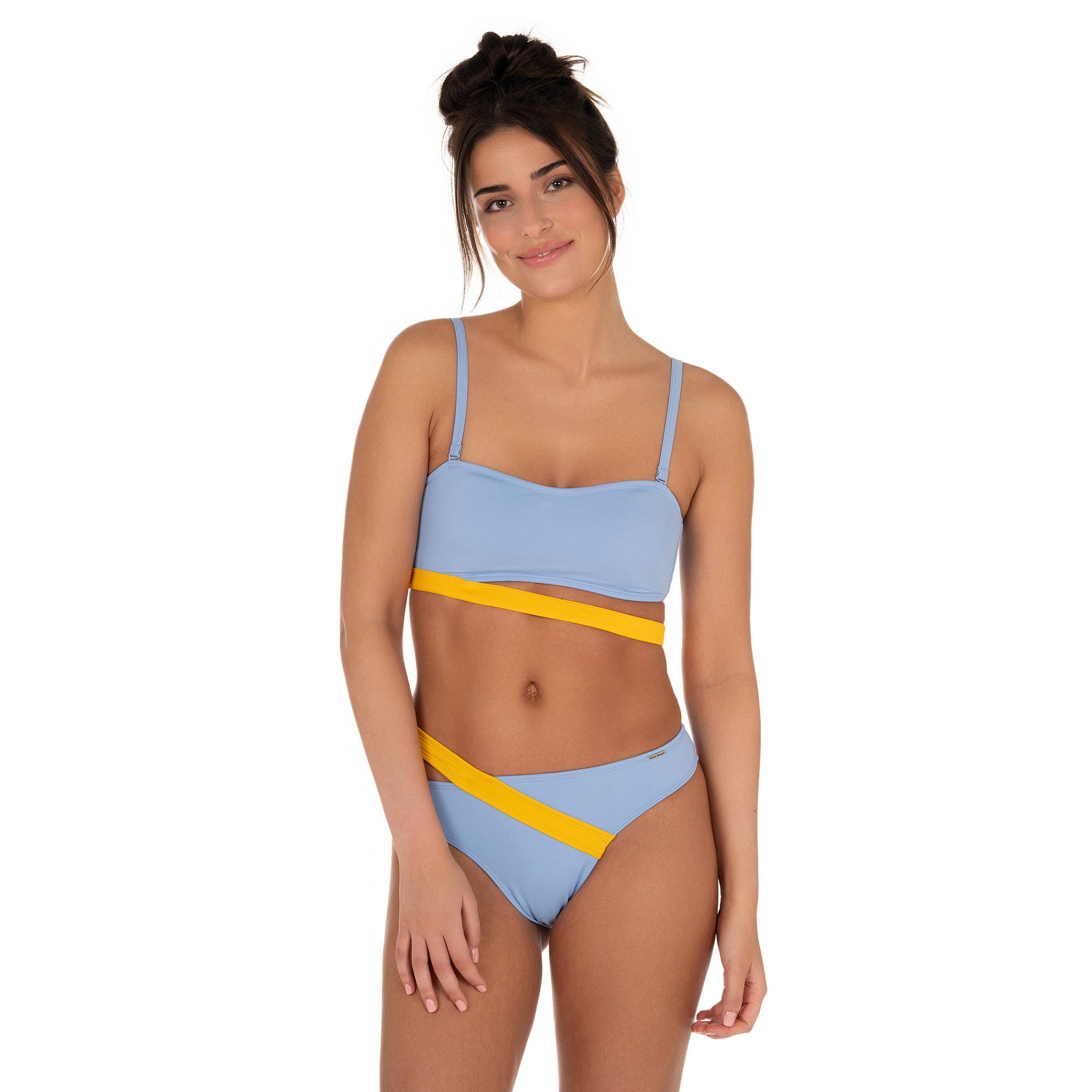 You want the perfect match for the Lobos top from bruno banani? Voilà - here are the Lobos bikini bottoms, which are just as stylish as they are comfortable. The clean light blue colour meets a cheeky yellow accent that casually drapes over the side of the waist and adds that little bit extra. Whether as a classic brief for a little more coverage or as a sexy thong version - you decide how much you want to show. Fits perfectly, keeps everything in shape and looks ultra-cool. Summer mode: activated!
